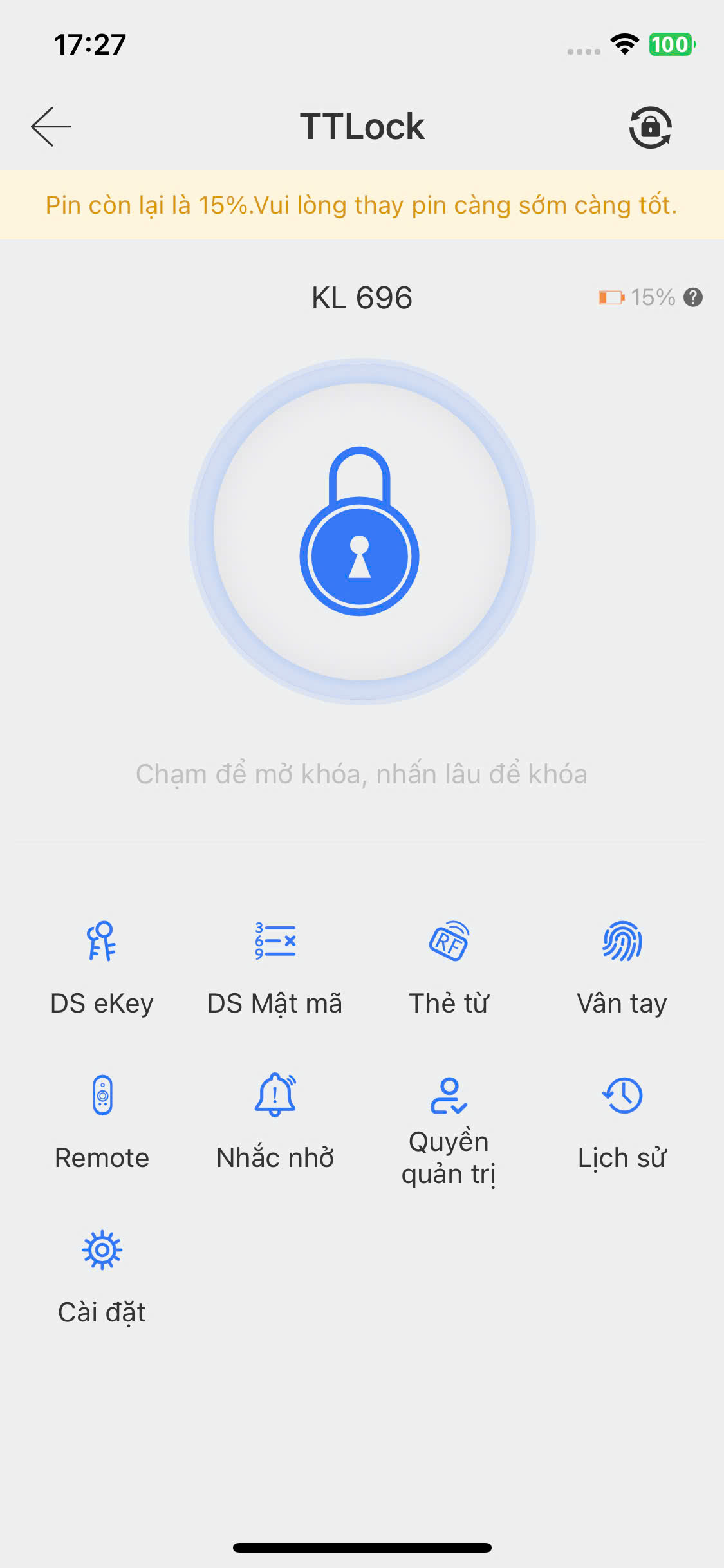 Cách làm: Thử đứng gần khóa và bấm lệnh mở cửa trên App. Trong một số trường hợp, lệnh từ App tiêu tốn ít năng lượng hơn việc quét vân tay và có thể giúp bạn vào nhà.